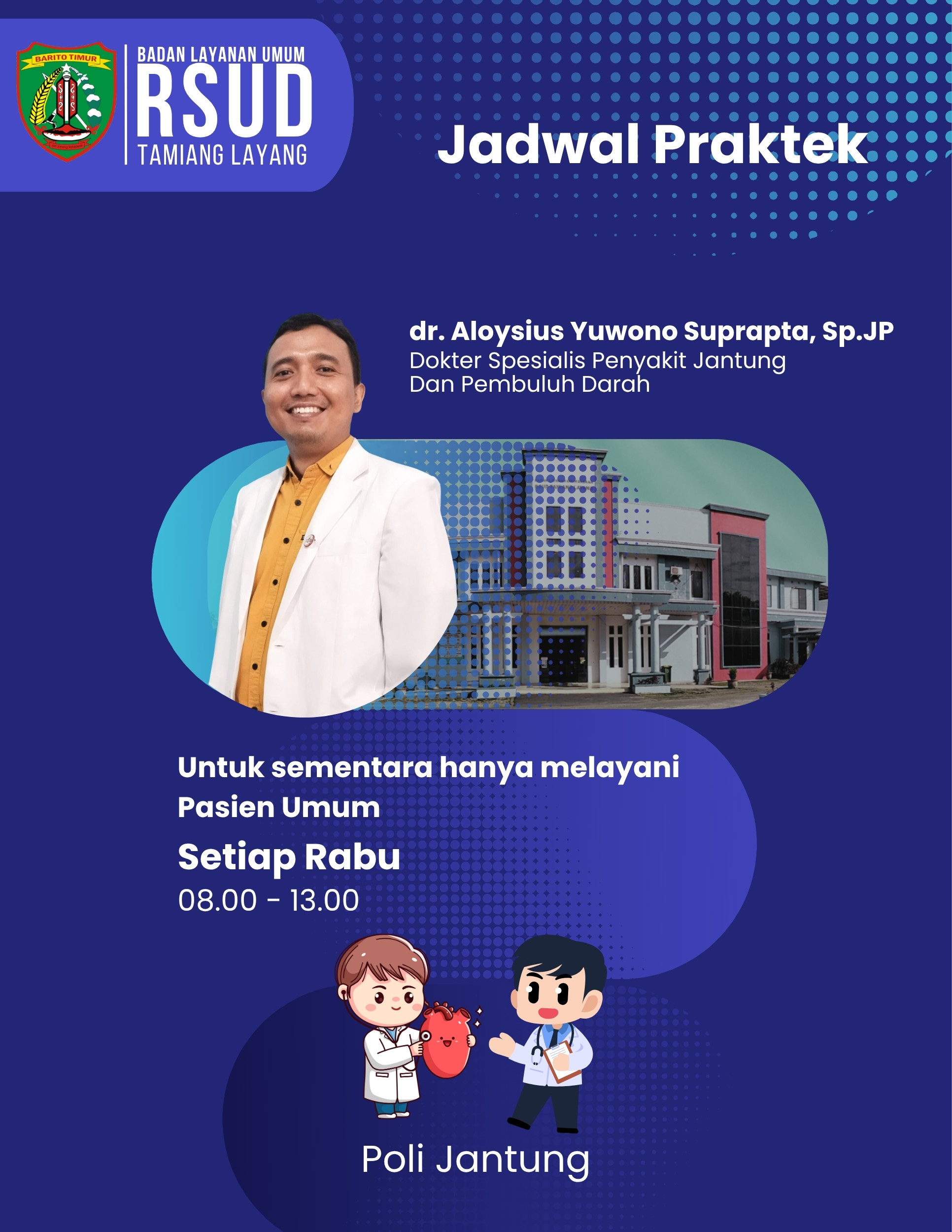 Halo hengau sehat Kabar gembira, sekarang RSUD Tamiang Layang dapat melayani pasien jantung & pembuluh darah yang ditangani oleh dr. Aloysius Yuwono Suprapta , Sp.JP pada setiap hari Rabu. Untuk saat ini melayani pasien umum, sambil menunggu proses kredensial oleh BPJS agar bisa memberikan pelayanan secara merata kepada masyarakat Kabupaten Barito Timur 🙏
